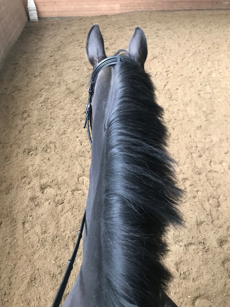 Dagens utmaning var att rida skänkelvikning utmed första fjärdedelen av långsidan för att därefter rakställa hästen och vända över ridbanan genom två korridorer av bommar, fortsätta i samma varv, vända in på diagonalen, gå in i en skänkelvikning för att därefter komma ut på kortsida, byta varv och göra övningen i andra varvet. Mackan lyssnade bra, jag satt mer rakt upp i skänkelvikningarna än i övrigt och på det stora hela gick det riktigt bra. Jag hade tidigare berättat för LM att Mackan brukade gå som en lång ridskolehäst när jag rider på det bettlösa, så att hon skulle vara beredd på det, men en bit in i träningen sa hon ”titta i spegeln nu, tycker du fortfarande att han ser lång ut?”. Nej, han såg riktigt fin ut! Det måste vara att vi aktiverade både bakben och core på honom som gjorde att han ”föll på plats”. Kul!