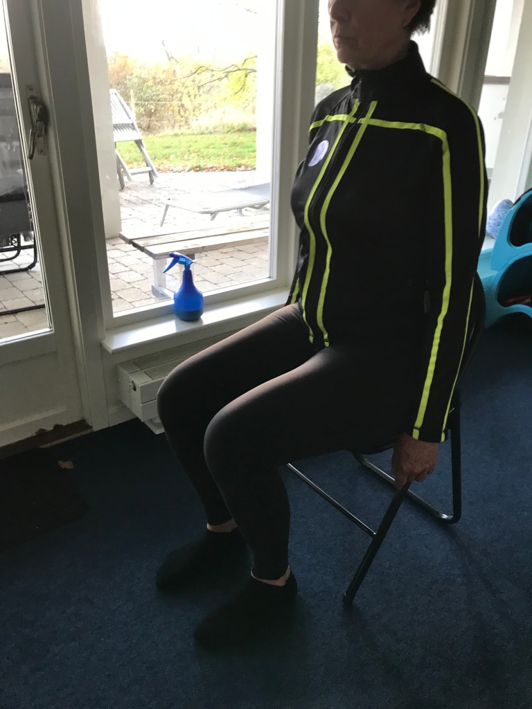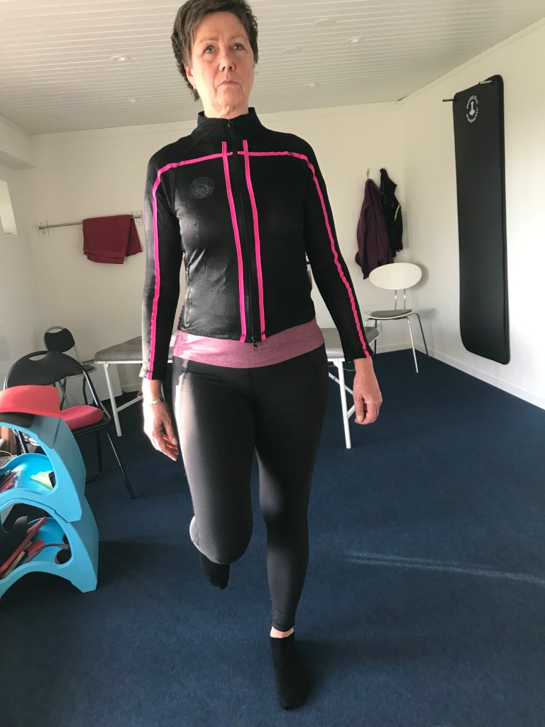 Besöket började med att jag fick ta på mig en streckjacka och ställa mig framför spegeln. Men redan när jag kom in hade Lena observerat vissa saker gällande min kropp och som jag själv var helt omedveten om, dels gällande mitt bäcken men också hur jag placerade min kropp när jag stod rätt upp och ned på golvet. 😀 När Lena sedan analyserade min kropp så fick jag bland annat stå på ett ben i taget, stå på tå, böja mig åt sidorna och sitta på en mjuk gummikudde och lyfta ett ben i taget. Under tiden jag gjorde det här berättade Lena vad hon såg och då blev det även synligt för mig. Intressant! 🙂
