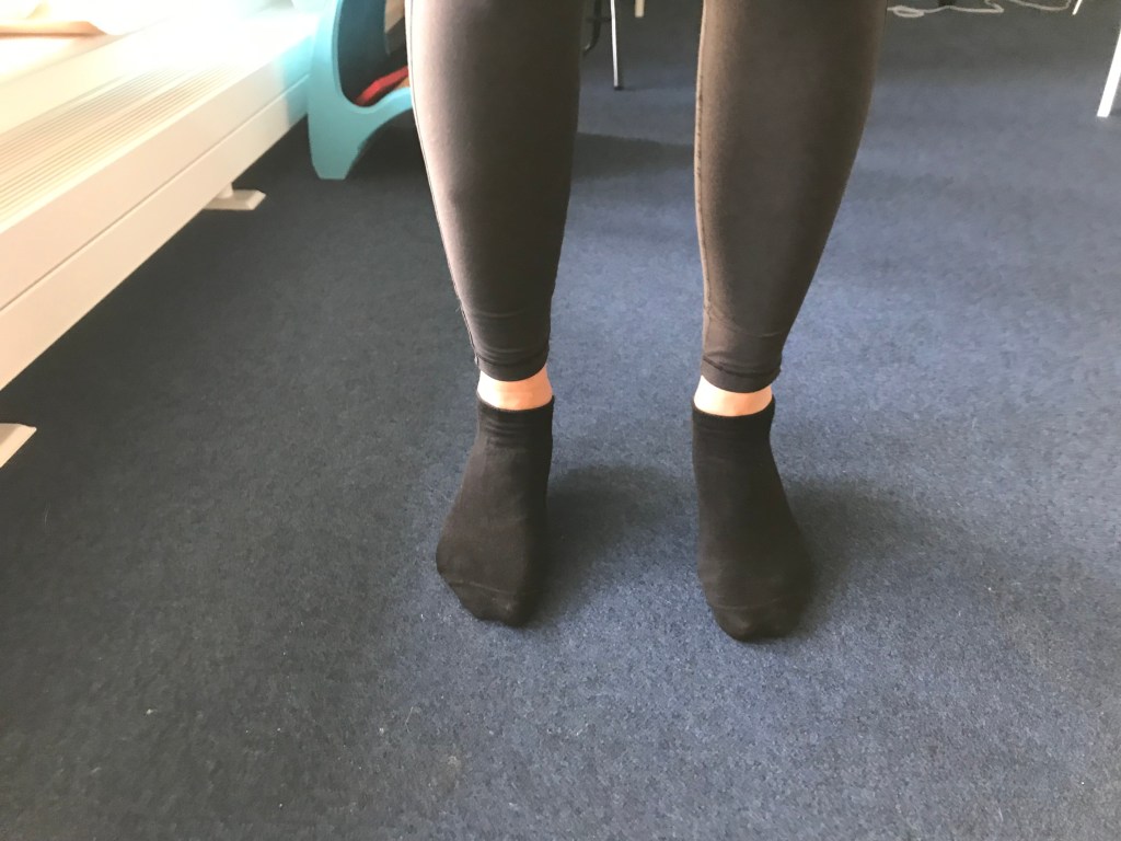 När jag stod på höger ben så sköt jag ut höften, vilket jag inte gjorde när jag stod på vänster ben, och när jag stod på tå så var höger fotled väldigt instabil, vilket inte vänster var. Hmmm… Jag är svagare i höger sida och behöver arbeta mer på liksidighet framöver. För att få lite ”hjälp” med kroppen när jag ska stå på ett ben så kan jag hålla ett finger i väggen samtidigt som jag är noggrann med att inte låta höger höft falla ut.
