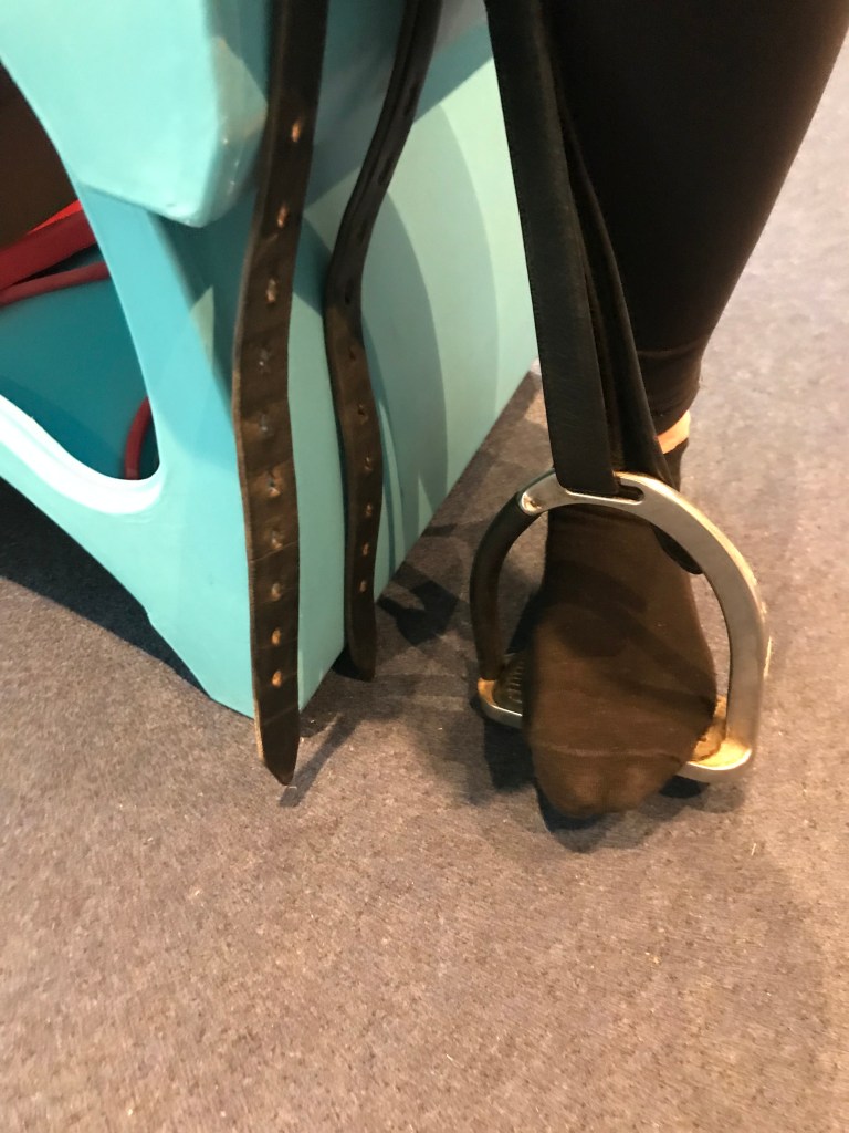 Jag har under en längre tid haft mina stigläder under kåpan för att spara sadeln men Lena anser att den lösningen blir sämre för mina höftleder i och med att lädret då trycker ut kåpan och indirekt påverkar lederna. Så från och med nu ligger mina stigläder utanför kåpan. 😉 När jag satt i min sadel så tittade Lena även på hur mina fötter föll och hur mina stigbyglar är vinklade och föga förvånande passade mina fötter inte stigbyglarna optimalt. Lösningen på det här var att vända stigbyglarna så att de hängde på fel håll, dvs med säkerhetsanordningen inåt, och då passade de mina fotvinklar mycket bättre och jag fick stöd även under stortåleden. Enligt Lena spelar det ingen roll på vilken sida man har säkerhetsanordningen och att studier har visat att det till och med kan vara bättre att ha dem på insidan. 🙂 Jag blev även rekommenderad att köpa stigläder med T-spänne för att undvika att spännet på stiglädret påverkar höftlederna.